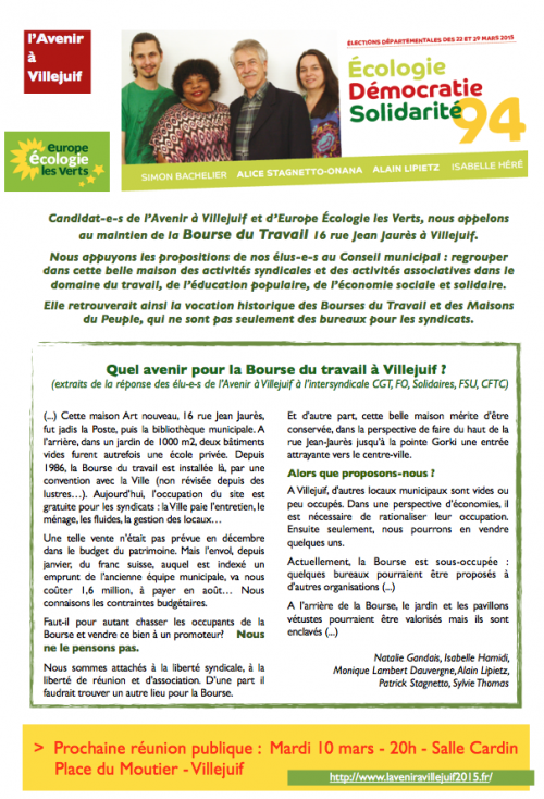 Candidat-e-s de l’Avenir à Villejuif et d’Europe Écologie les Verts, nous appelons au maintien de la Bourse du Travail 16 rue Jean Jaurès à Villejuif.